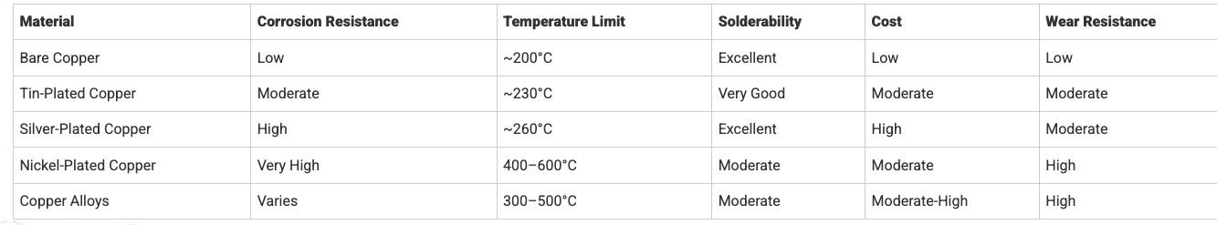 Tin-Plated Copper: Provides some corrosion resistance and improves solderability but has lower mechanical durability under vibration and high heat.